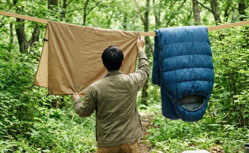 シュラフの保温力は、中綿(ダウンや化繊)がたっぷりと空気を含む「ロフト(かさ高)」によって保たれています。収納袋に詰め込まれた状態が続くとロフトが潰れてしまうため、干す際は両手で軽くパンパンと叩いて空気を含ませ、中綿の偏りを直すことがポイントです。