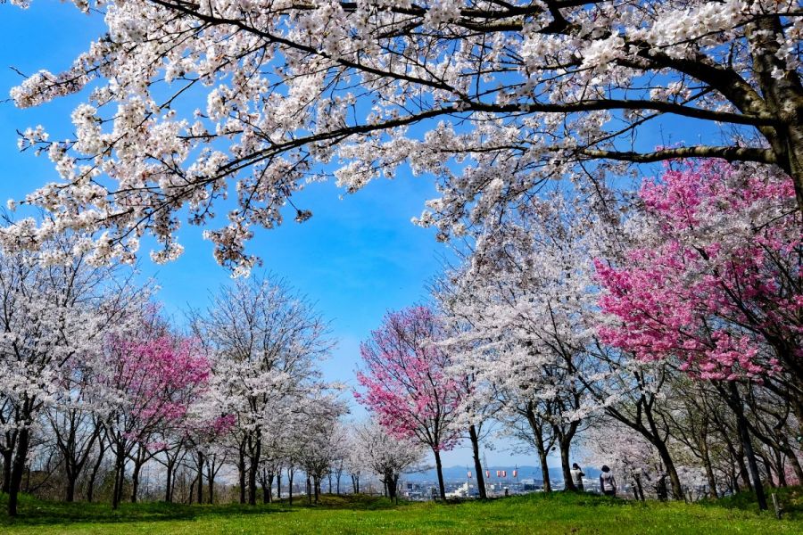 長野県飯山市にある白山森林公園は、地元以外ではあまり知られていない絶景スポットです。山の斜面に広がる桜と、背景にそびえるまだ雪の残る山々とのコントラストが美しく、まるで絵画のような光景が広がります。標高が高いため開花はやや遅めですが、その分ゆっくりと楽しめるのが魅力です。自然の静けさの中で過ごす時間は、都会の花見とはまた違った癒しを与えてくれます。